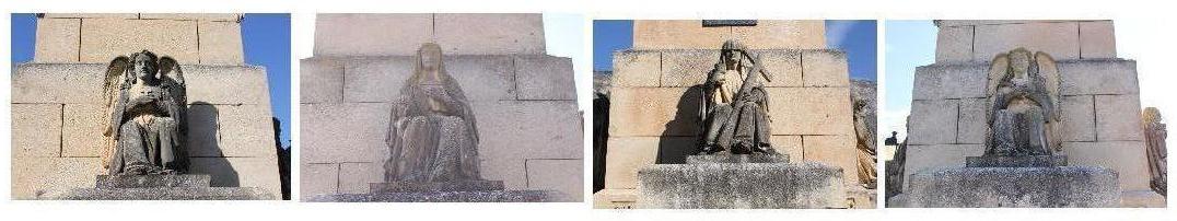 | El panteó té quatre figures escultòriques en cada cara: la Fe, l’Esperança, la Caritat i les Bones Obres (no estan ordenades), ensems que el de Quijano (la Fe, el Valor, la Caritat i la Temperança). La làpida va caure i està perduda. |