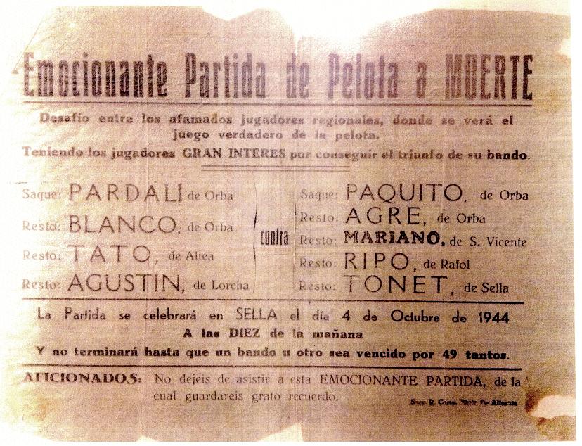 Salvador Garcia ha aconseguit el cartell de la Partida de Festes de Sella de l’any 1944. Ara per ara, és el cartell més antic que es conserva i hi apareixen diversos jugadors reconeguts. Entre ells, Tonet Ferrer (Tonet de Sella), a qui li vam fer una entrevista l’any 2003, publicada al número –de la revista El Cabiló.