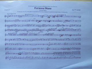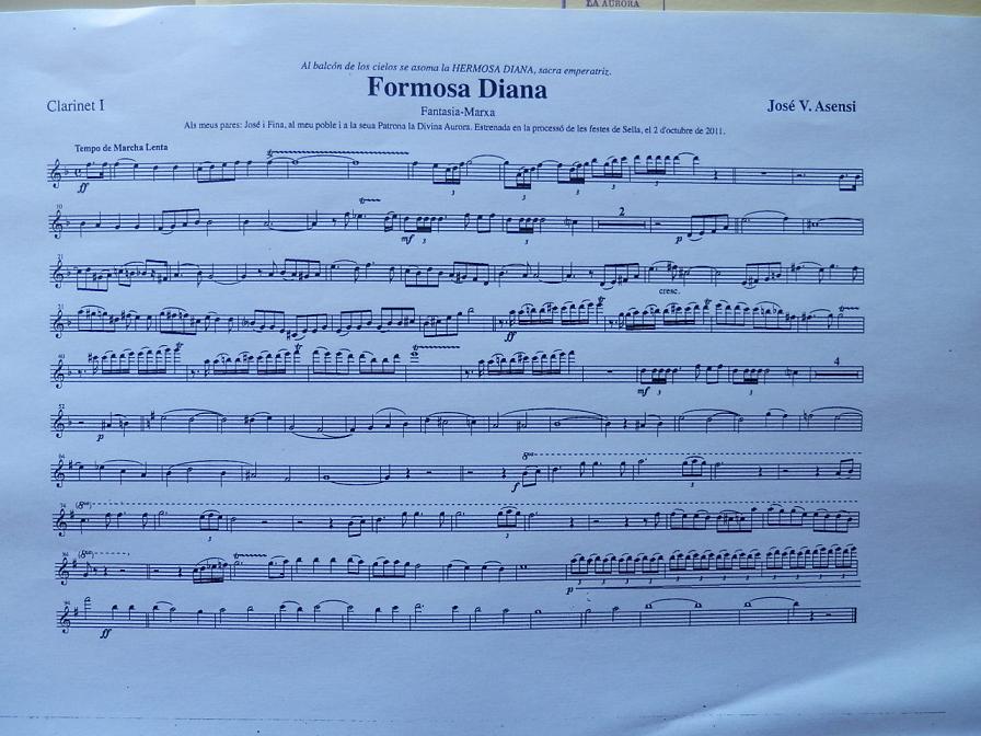 | Partitura per a Clarinet 1r de Formosa Diana de J.V. Asensi. Llegiu la sentida dedicatòria que fa el seu autor. |