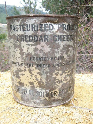 Pot de formatge americà conservat en un mas de Tagarina: “Donated by the people of the United States of America” (for the people of Sella) |