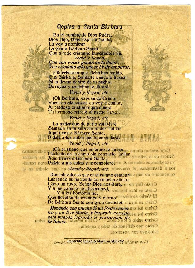 Amb ocasió de les festes en honor a Santa Bàrbera que se celebren aquest cap de setmana a Sella, presentem unes cobles del segle XIX dipositades a l’Arxiu i sobre les quals hem realitzat una xicoteta investigació.