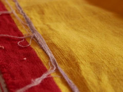 | Detall de la resta de tela morada que va ser descosida |