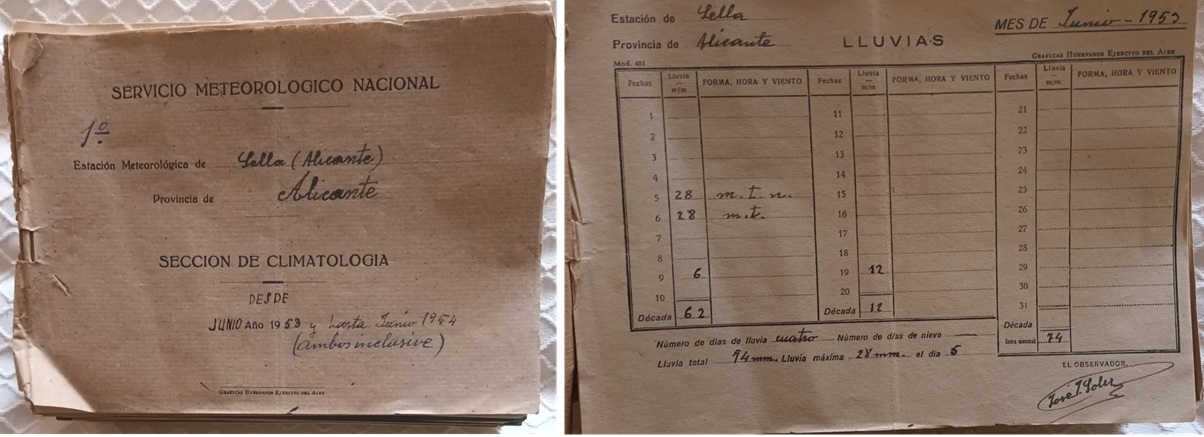 La tasca dels observadors és molt desconeguda, de manera que volem aprofitar per a aclarir un poc l’origen d’estes dades tan valuoses i d’ús habitual per part de tots. El primer i més prolífic dels observadors va ser el mestre Jesús Soler Ronda, que va exercir la seua tasca durant 46 anys, començant en juny de 1953 i acabant en maig de 1999, poc abans de la seua mort amb quasi cent anys. Don Jesús tenia un pluviòmetre oficial proporcionat per l’Institut Nacional de Meteorologia (actual AEMET) i apuntava en els seus quaderns les dades de pluges i altres circumstàncies especials, com les nevades. Els seus quaderns, els originals dels quals conserva la seua família, alimenten les bases de dades climàtiques nacionals i són un xicotet tresor documental per a Sella.