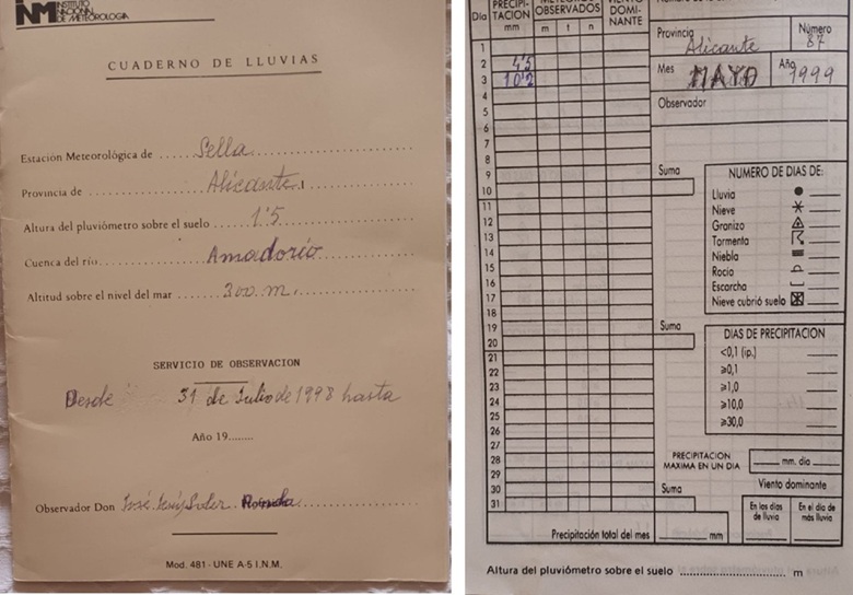 La tasca dels observadors és molt desconeguda, de manera que volem aprofitar per a aclarir un poc l’origen d’estes dades tan valuoses i d’ús habitual per part de tots. El primer i més prolífic dels observadors va ser el mestre Jesús Soler Ronda, que va exercir la seua tasca durant 46 anys, començant en juny de 1953 i acabant en maig de 1999, poc abans de la seua mort amb quasi cent anys. Don Jesús tenia un pluviòmetre oficial proporcionat per l’Institut Nacional de Meteorologia (actual AEMET) i apuntava en els seus quaderns les dades de pluges i altres circumstàncies especials, com les nevades. Els seus quaderns, els originals dels quals conserva la seua família, alimenten les bases de dades climàtiques nacionals i són un xicotet tresor documental per a Sella.