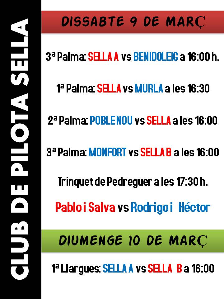 Les partides han començat en la Plaça Major de Sella amb el debut de molts jugadors nous. Ha sigut en la partida de 3a de palma del grup B on San Vicent ha guanyat 4 -10 als nostres. Tot i el resultat, la partida ha estat entretinguda i amb jocs disputats. Ha durat 2 hores. Molt bon ambient de públic local i visitant. Ànim que açò acaba de començar !!